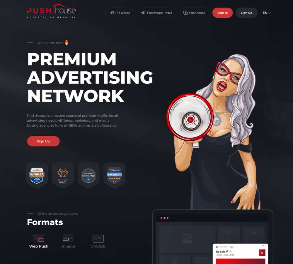 Push.House is a leading push ad network, consistently ranking among the top advertising platforms. Designed specifically for affiliate marketers, it operates on a CPC model, ensuring you pay only for actual clicks. By leveraging a real-time bidding (RTB) algorithm, Push.House provides transparent pricing and dynamic bid management – crucial when analyzing push vs. InPage advertising.