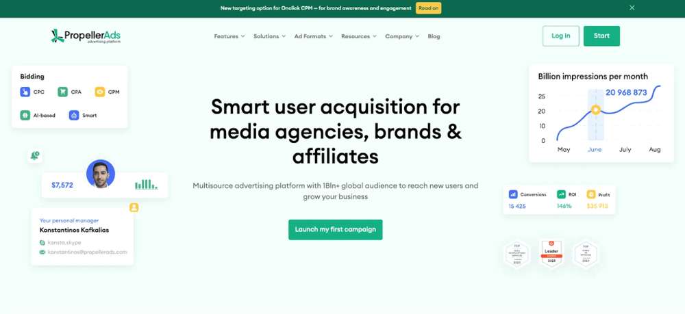 This platform offers low bid prices (starting from $0.0001 per click) and highly effective ad formats – Web Push, InPage, and OnClick (popunder) – making it an ideal choice for those looking for top-tier traffic arbitrage networks.