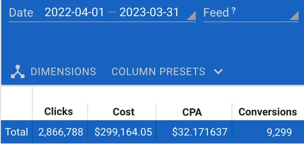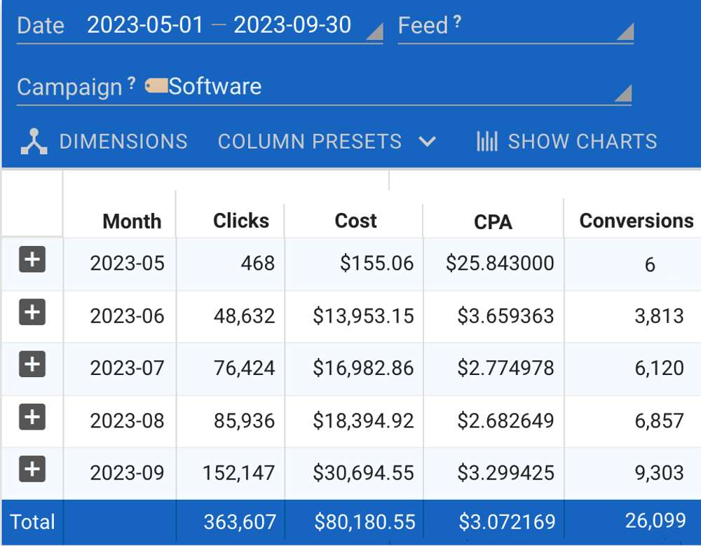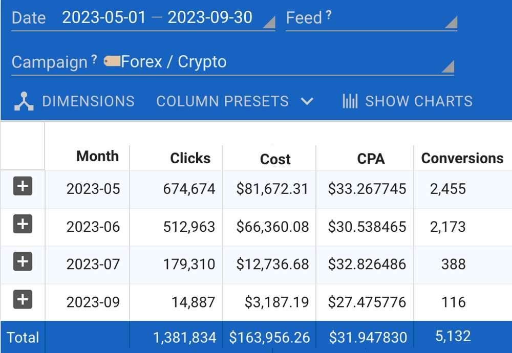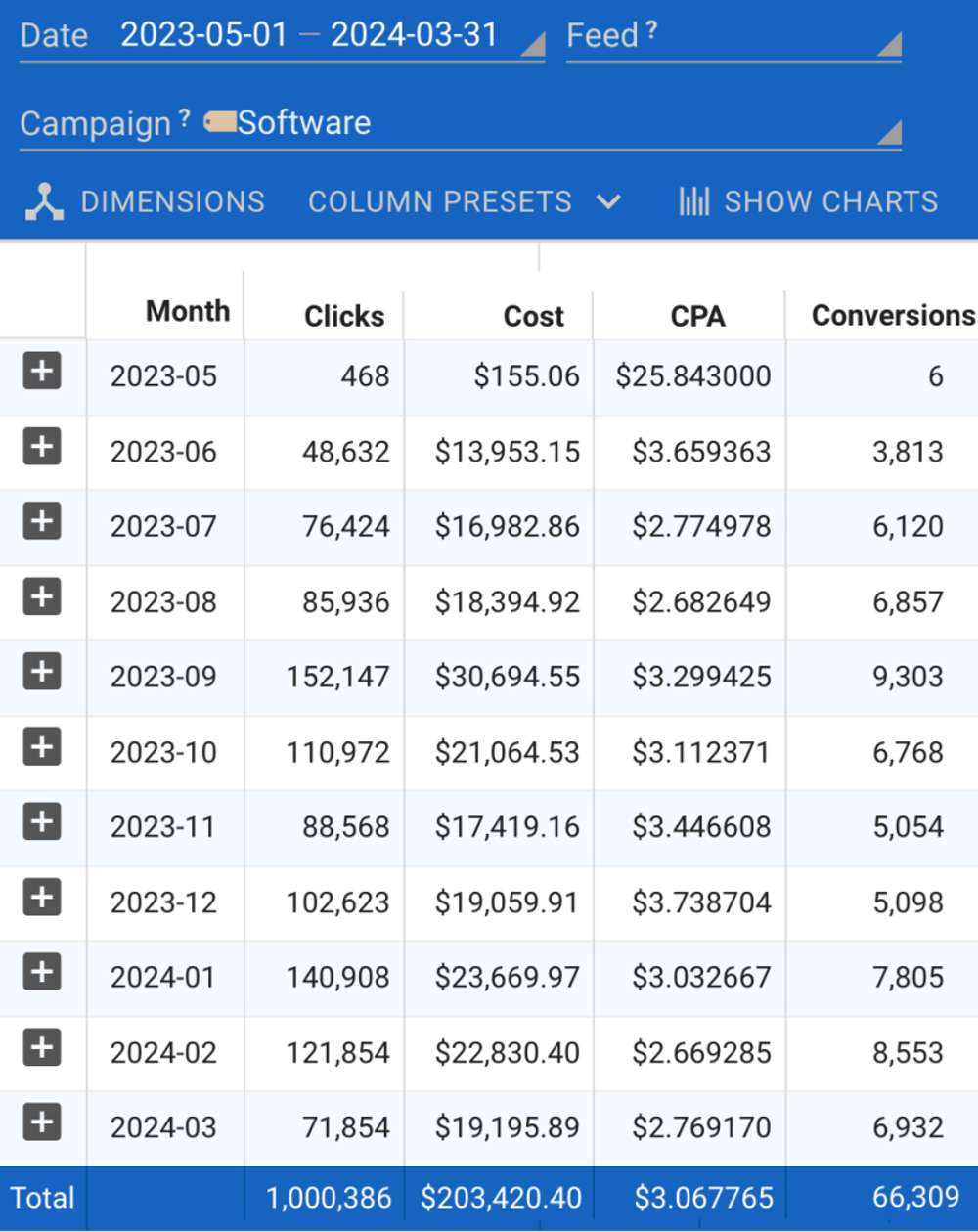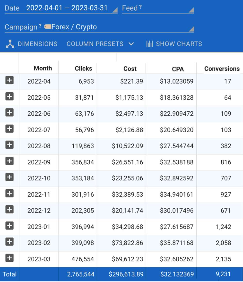Bottom line: the Master Affiliate’s total spend for the year 2022-2023 was $296,613.89. He was happy with the traffic and planned to maintain momentum, hoping to diversify his vertical portfolio in the future.